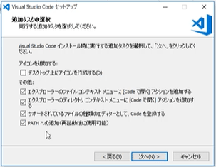 - 追加タスクの選択のパートで以下の項目に✓をいれて「次へ」を押下。これらにチェックを入れておくと便利。